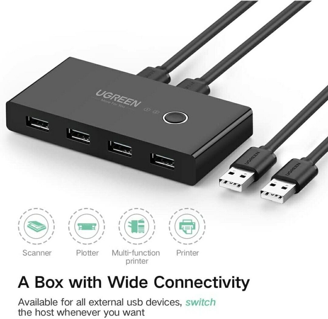 En outre, le sélecteur de partage UGREEN USB 2.0 2x4 est alimenté par USB et ne nécessite pas de source d'alimentation externe supplémentaire, ce qui le rend facile à utiliser et à transporter. Il est également livré avec des câbles USB pour connecter les ordinateurs et les périphériques, ce qui élimine le besoin d'acheter des câbles supplémentaires.